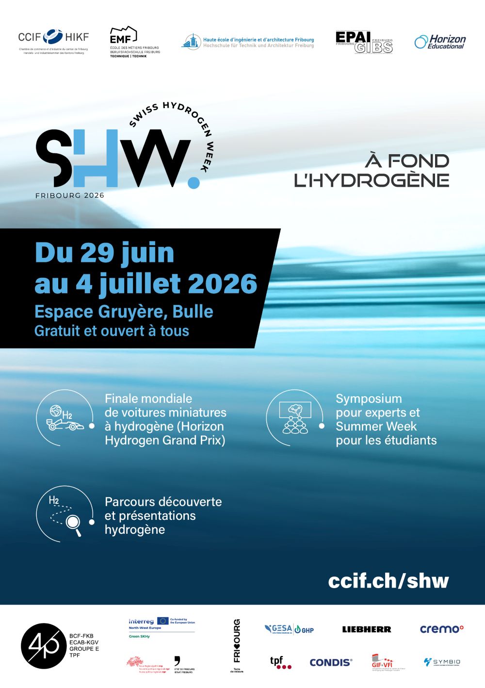 La Swiss Hydrogen Week est organisée par la Chambre de commerce et d’industrie du canton de Fribourg (CCIF), l’École des Métiers de Fribourg (EMF), l’Ecole professionnelle artisanale et industrielle (EPAI) et la Haute école d’ingénierie et d’architecture de Fribourg (HEIA) , avec le soutien du projet européen Interreg Green SKHy, de la Nouvelle politique régionale npr, de l’Etat de Fribourg, des 4 piliers de l’économie fribourgeois (4P), de l’Association Fribourgissima, des entreprises Gruyère Energie, Gruyère Hydrogen Power, Liebherr Machines Bulle, Transports Publics Fribourgeois (TPF), Condis ainsi que le Groupement industriel fribourgeois (GIF).